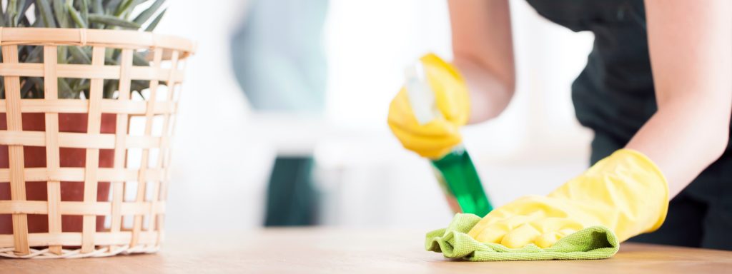 A woman in black overalls and yellow, rubber gloves dusting a table with a plant