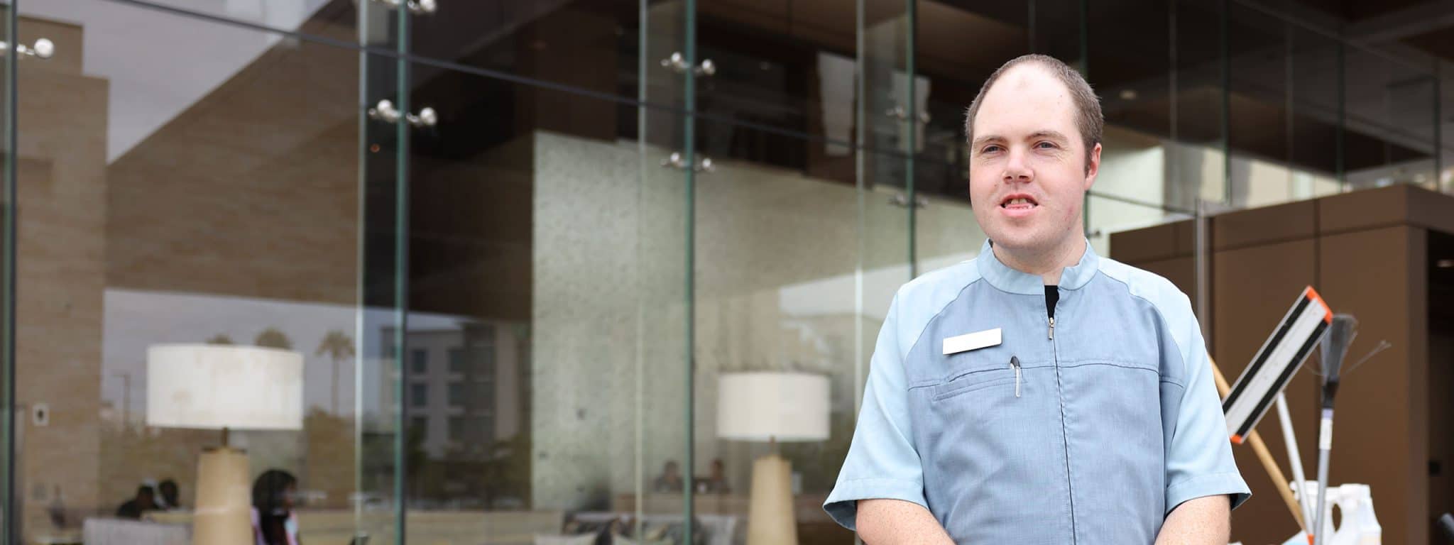 You can see Ben Godown’s face light up when he talks about his job as a custodian at the Legacy Hotel and Spa. After being placed by our San Diego Employment Services team—funded by generous donations to The Michael Ziegler PRIDE Industries Foundation—Ben had the chance to shine at his new job. Not only does he enjoy working with the hotel’s international clientele, but he also appreciates earning a paycheck and gaining new friendships.