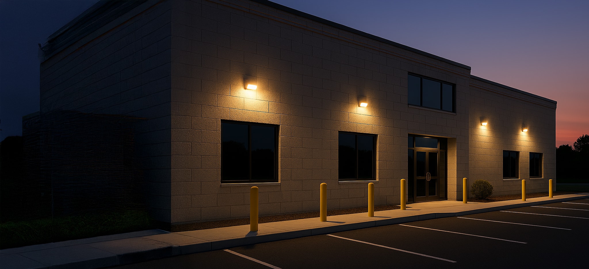 The side of a glass office building with well-trimmed landscaping and lots of exterior lights