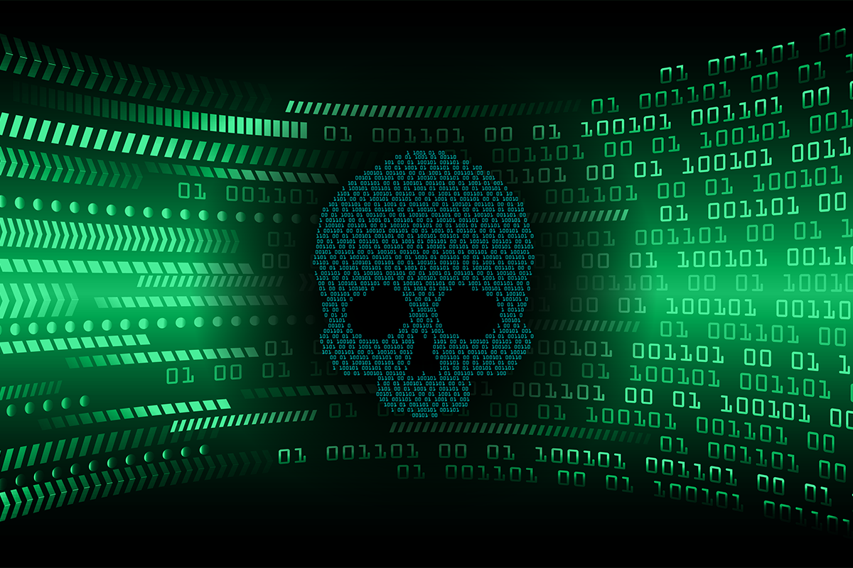 A graphic skull composed of zeroes and ones superimposed over a green computer display
