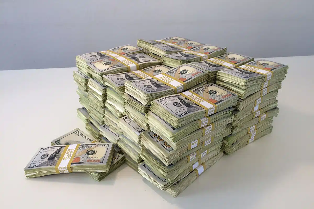 Multiple stacks of American money sit on a white table