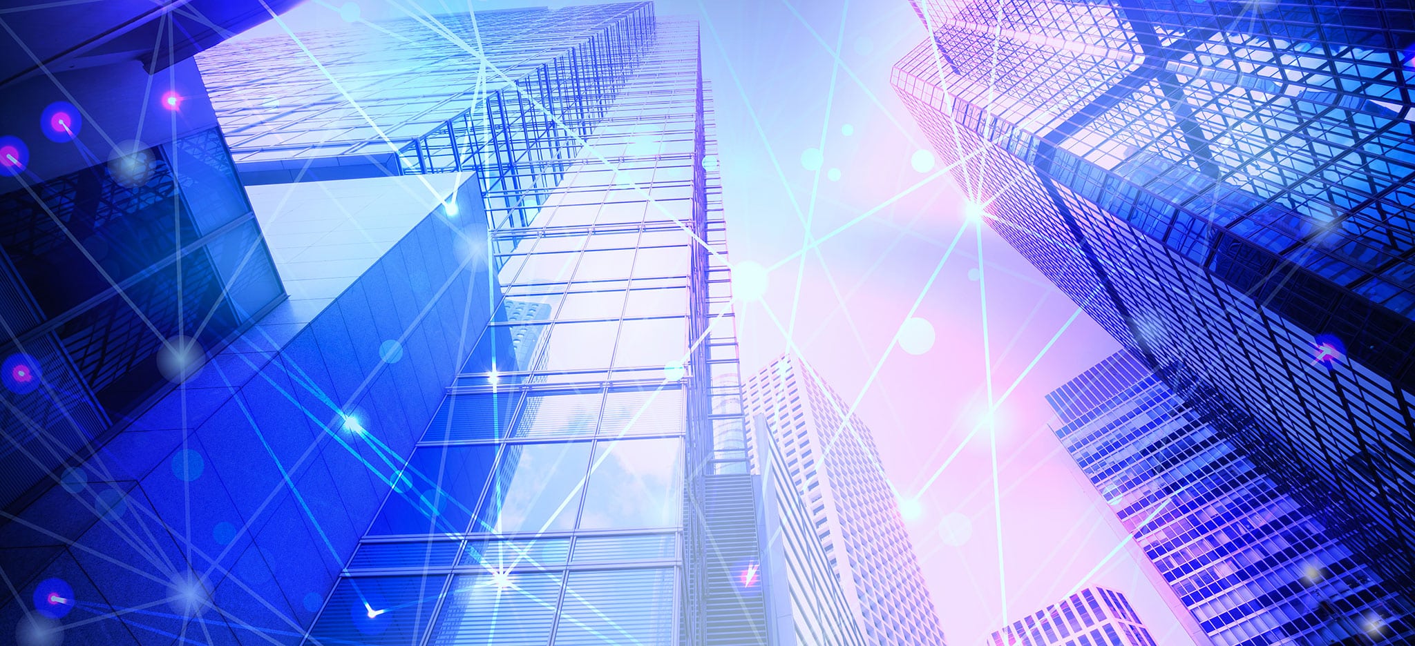 A graphic that uses icons to represent building systems connected by smart technology, superimposed over a photo of high-rise buildings