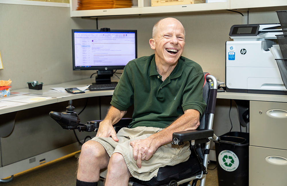 man in green shirt sitting in wheelchair in front of computer smiling